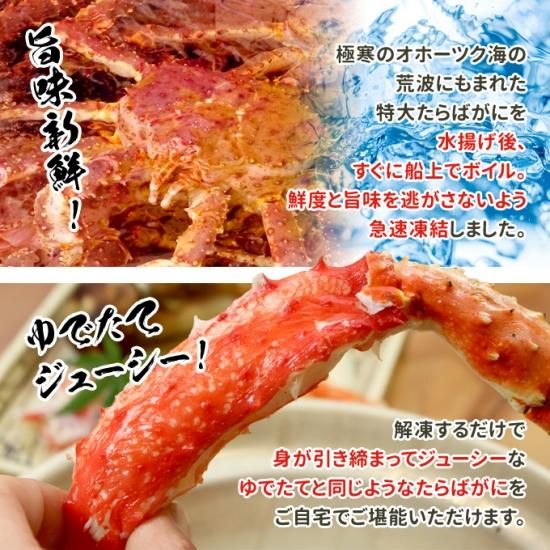 極寒のオホーツク海の荒波にもまれた特大タラバガニを水揚げ後すぐに船上でボイルし、鮮度と旨味を逃がさないよう船上急速凍結。
